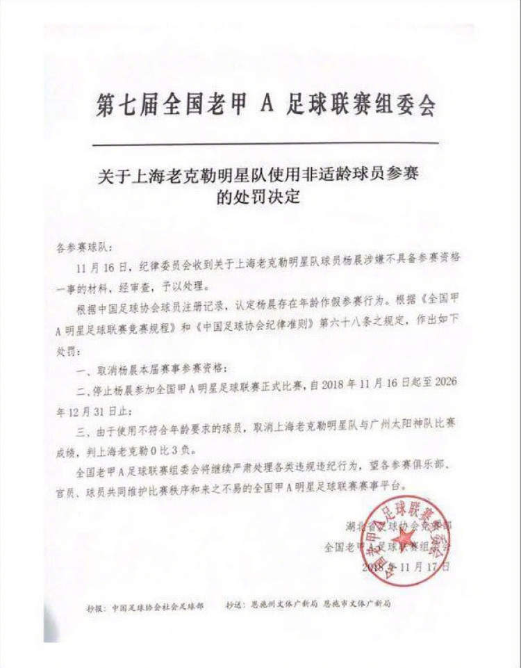 11月17日晚,全国老甲A足球联赛组委会发布公告,对上海老克勒与广州太阳神比赛中涉嫌使用违规球员一事作出裁决。上海老克勒被判0比3负,涉事球员杨晨被取消参赛资格,并被禁止参加老甲A比赛至2026年12月31日。