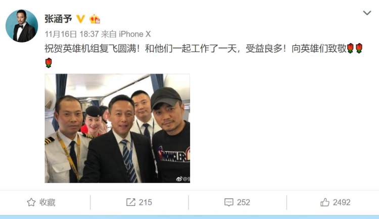 川航复飞活动结束后,张涵予还特地在微博发布合影,祝贺英雄机组复飞成功。