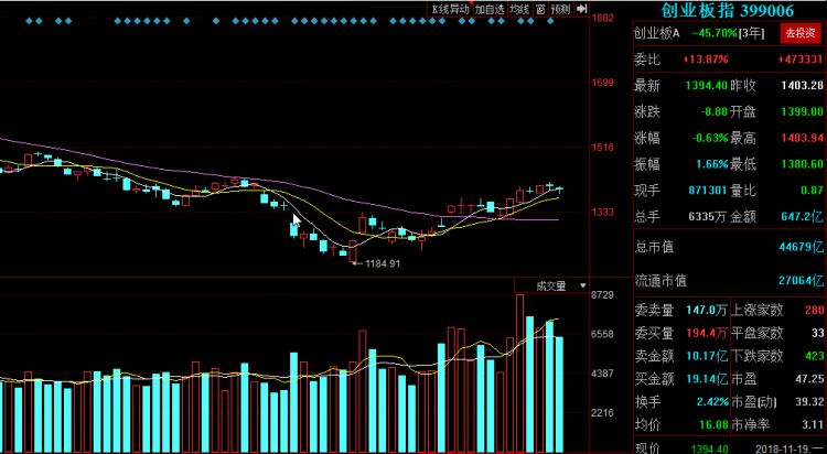 2. 从盘面全天走势观察,权重股走势强于小盘股,应该是补涨效应,以便跟上大盘的总体节奏。创业板在上轨线踟蹰不前,部分获利筹码在兑现,主要分类指数中,创业板指今日唯一绿盘报收,收报1394点,跌幅0.63%。