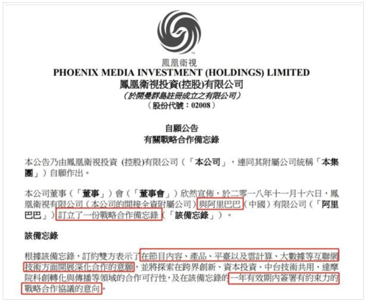 公告表示,订约双方在节目内容、产品、平台以及云计算、大数据等互联网技术方面开展深化合作的意愿,并将探索在跨界创新、资本投资、中台技术共用、达摩院科创转化与传播等领域的合作可行性,及在该备忘录的一年有效期内签署有约束力的战略合作协议的意向。