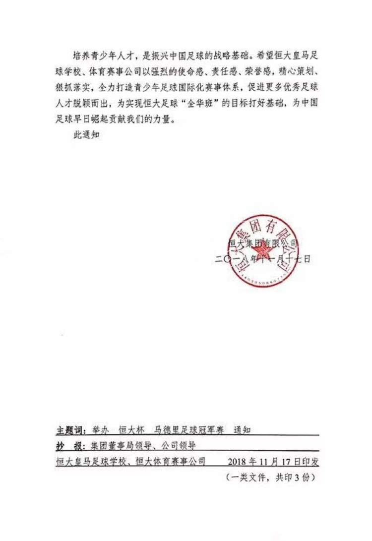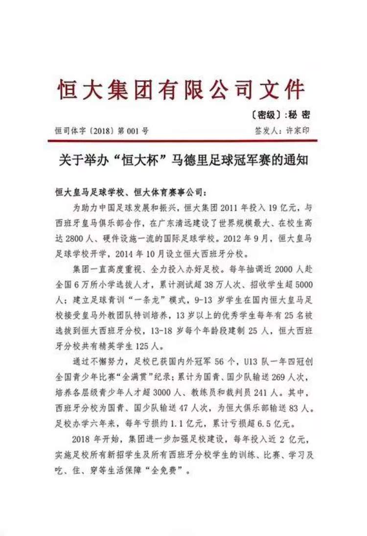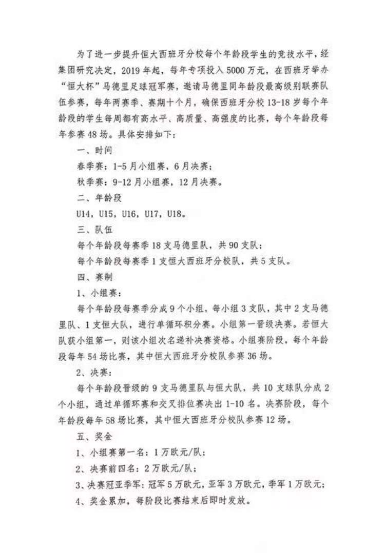 这个消息来自于被提前曝光的一份恒大内部的文件,这是一份名为《关于举办“恒大杯”马德里足球冠军赛的通知》文件材料。文件显示,从2019年开始,恒大每年专项投入5000万元,在西班牙举办U14-U18共5个年龄段的“恒大杯”马德里足球冠军赛,邀请马德里同年龄段最高级别联赛队伍参赛,确保恒大足球学校西班牙分校13-18岁每个年龄段的学生每周都有高水平、高质量、高强度的比赛,促进更多优秀足球人才脱颖而出。
