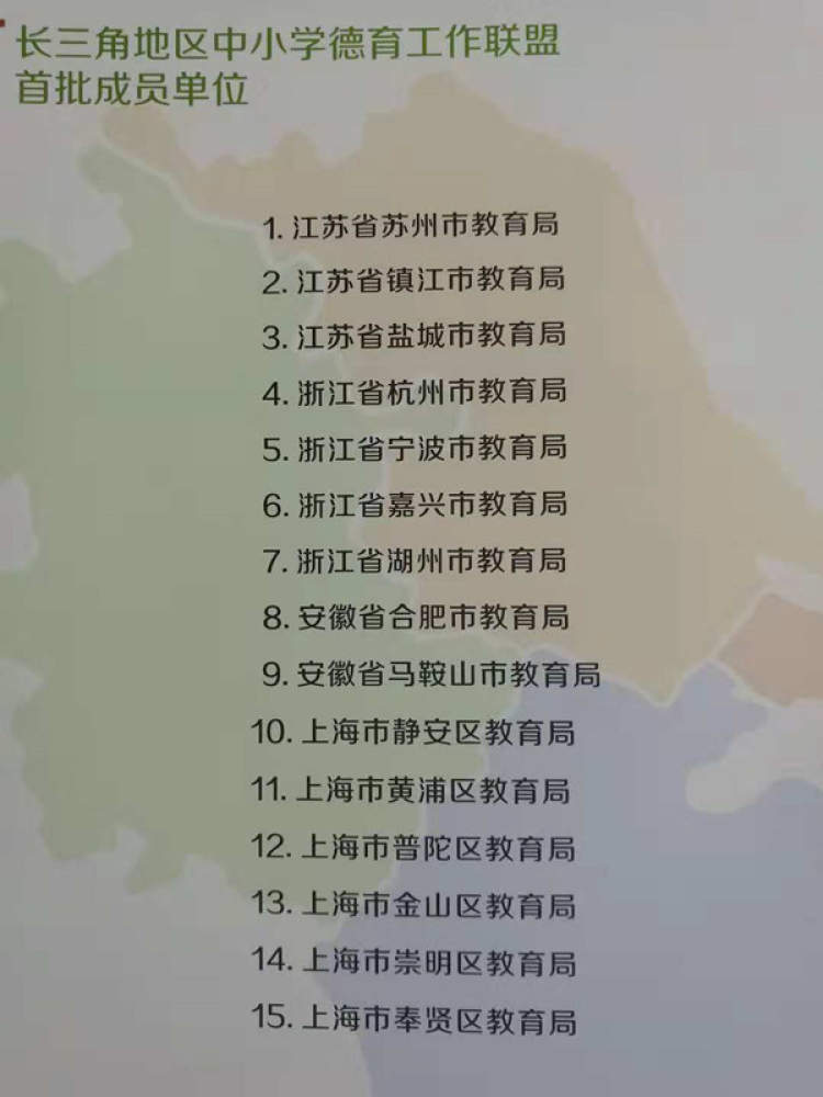 记者了解后获悉,长三角地区中小学德育工作联盟,是一个由上海市奉贤区教育局发起,长三角地区有关教育部门自愿参与,旨在构建“长三角德育一体化”教育共同体。本市哪些区和外省市哪些城市加入该联盟?记者发现除了奉贤区之外,本市的静安区、黄浦区、普陀区、金山区、崇明区这几个区的教育局也赫然在列,还有外省的杭州、苏州、宁波等城市的教育局也加入了该联盟。