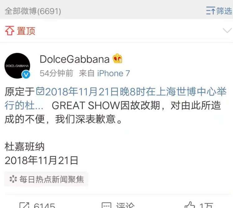 11月21日下午4点48分,D&G官方微博发布消息称,D&G原定于当晚8点在上海举办的首个大型时装秀 “因故改期”。