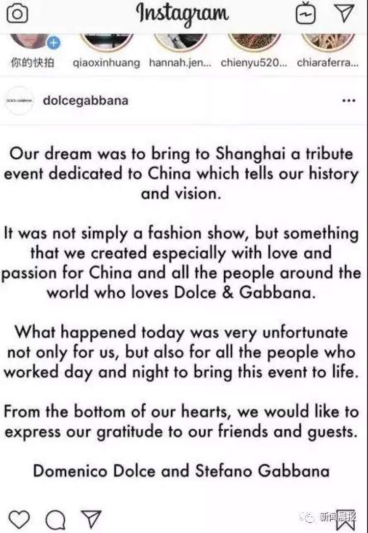 11月21日晚11时,D&G在官方Instagram上发布辱华事件回应称: