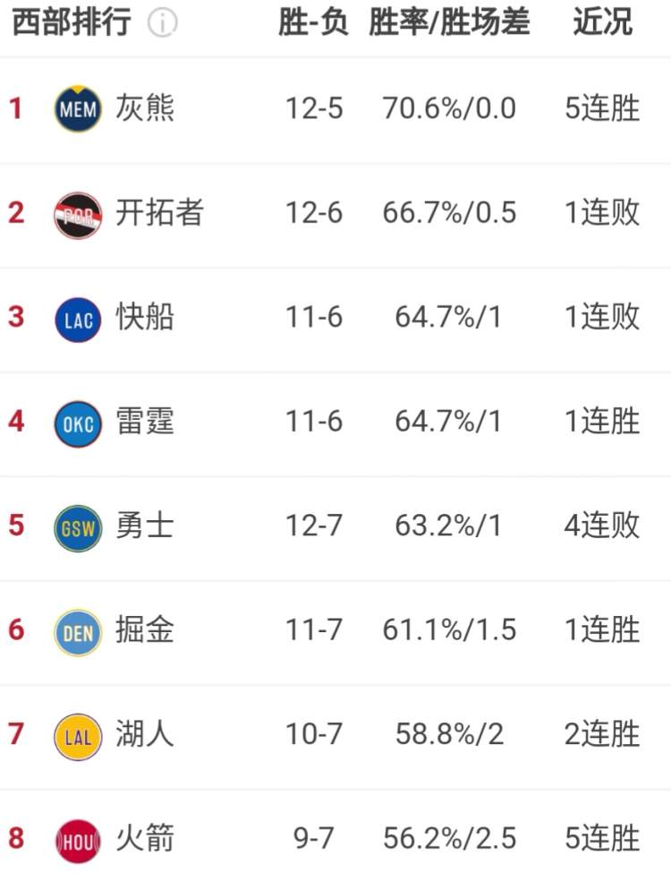 NBA西部排名,勇士已经落到第五
