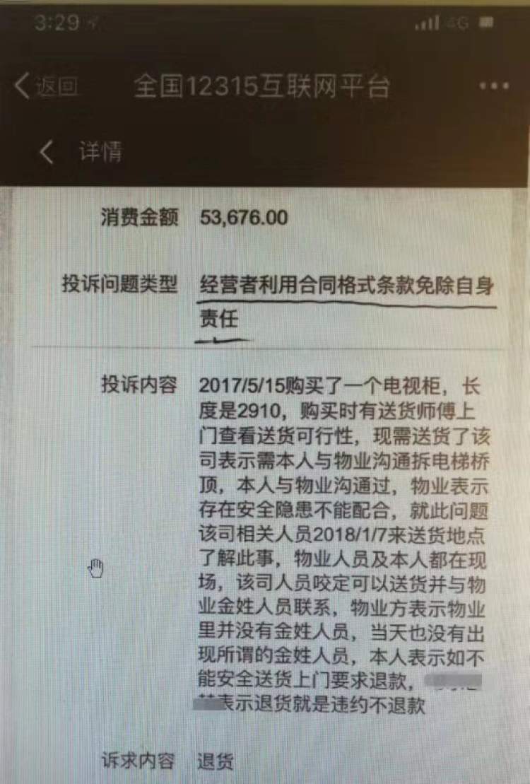 法院经公开庭审查明,为送货事宜,洪女士曾向12365(上海质检热线)申诉举报中心咨询“客梯能否拆轿顶或在轿顶上运输家具”,该中心回复称,上述行为不符合安全技术规范,应坚决制止。另查明,洪女士居住小区的物业公司两度向洪女士出具《情况说明》,明确表示经过现场测量,洪女士所购电视柜,因楼道、电梯狭窄不具备运输条件,并禁止通过拆除电梯轿顶或在轿顶上运送。