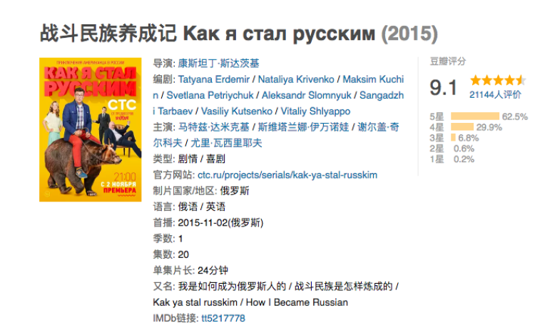 前段时间,豆瓣9.1高分的神剧《战斗民族养成记》吸引了一票中国粉丝。电视剧讲述了一个名叫阿列克斯的美国记者在俄罗斯发生的各种搞笑的经历。