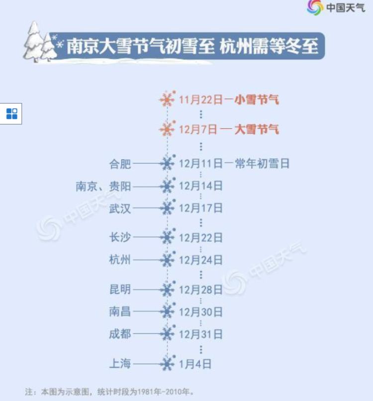 而像合肥、南京、武汉这些更偏南的地区,初雪一般要等到“大雪”节气。