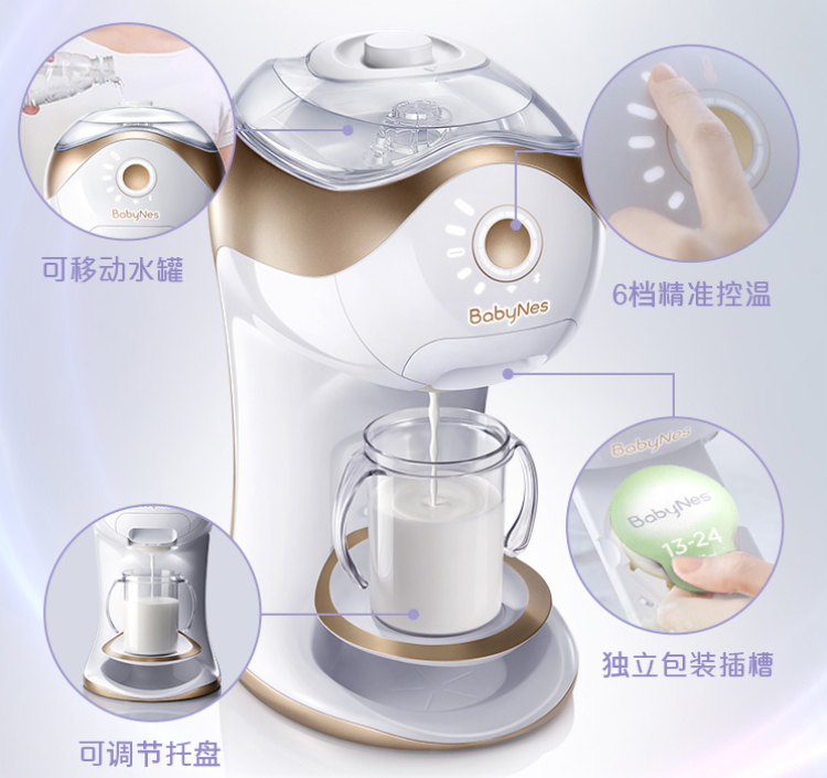 从此,给宝宝泡奶只需三步:冲调机注入纯净水,放入胶囊奶粉,手机或面板一键冲调。