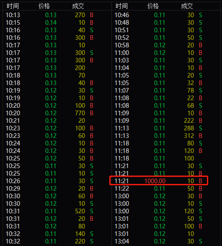 然而昨天上午11:21分,令人惊讶的场面出现:刚刚还是0.11元成交的ST蓝天,突然上蹿到1000元,暴涨9091倍,而后立马又回到0.11元。这一手1000元股价1000股,成交高达100万元。按正常股价0.11元,成交仅110元。110元可以买到的股票,却突然有人100万元买下来。那个在1000元卖出1000股的卖方,无疑是走了“狗屎运”。