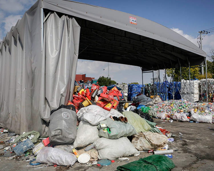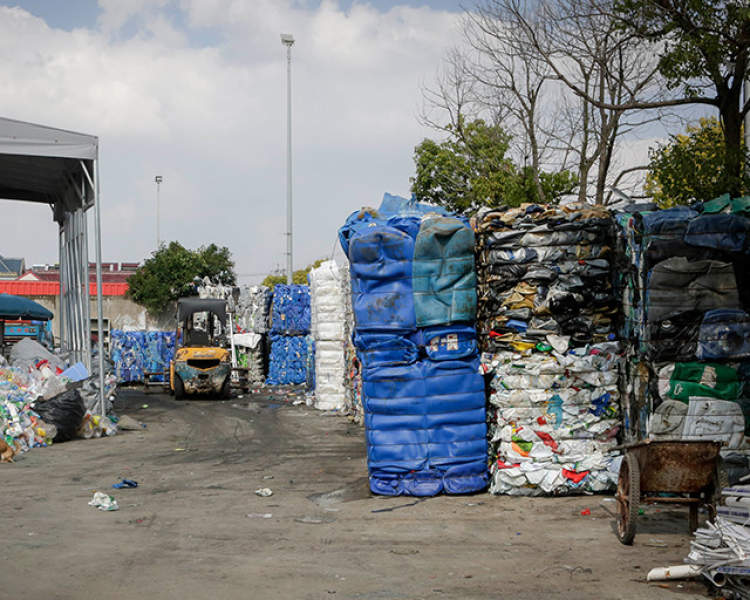场地正中央有一座高大的伸缩棚,棚架下面是这个塑料垃圾中转场的打包核心区域。由于棚子已经被推挤到一起,没有起到遮蔽作用,生产场地基本上是露天的。电钮按下去,工人将塑料垃圾送上传送带,进行简单分拣,就进行压缩打包,然后用叉车将这些打好包的成捆垃圾堆到墙边。废液、粉尘都没有任何处理措施。