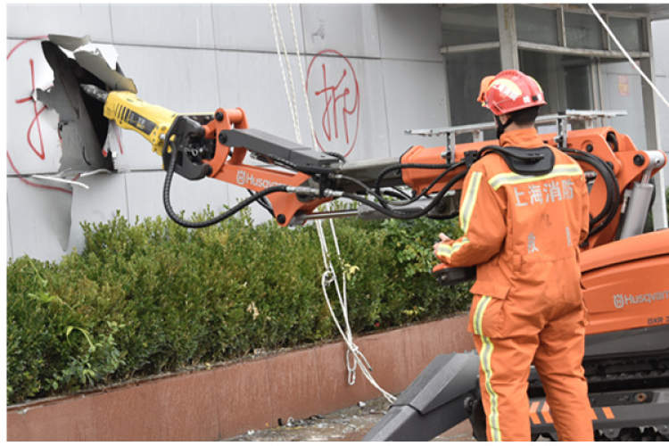 为加速冲烟楼层排烟,演习现场还出动了大型机械工程车和消防破拆机器人。几分钟的时间,建筑墙体就被破拆了一个大洞。