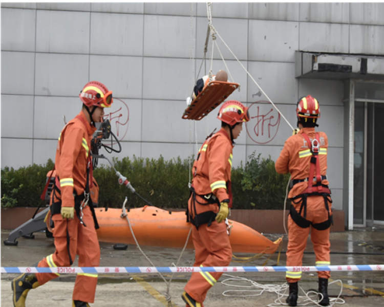这种“一点吊”救援技术用于高层建筑火灾人员救助,具有速度快、效率高的特点,解决了担架在狭窄楼梯间无法搬运、转弯和上下搬运时伤员倾斜的问题。