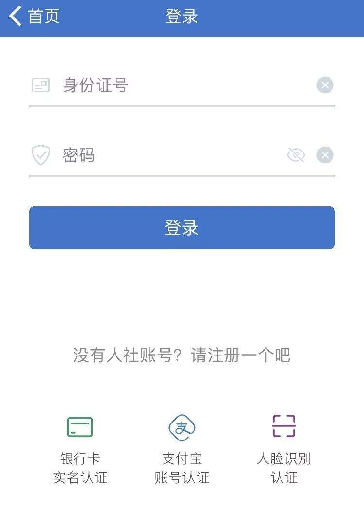 安装“上海人社”APP后,输入身份证及密码登录系统或通过“银行卡实名认证”、“支付宝认证”、“人脸识别认证”等方式完成人员信息认证后登录系统。