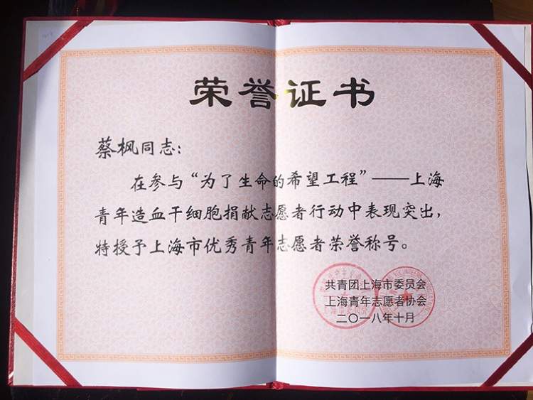 ■蔡枫获得上海市第414例造血干细胞捐献者奖牌