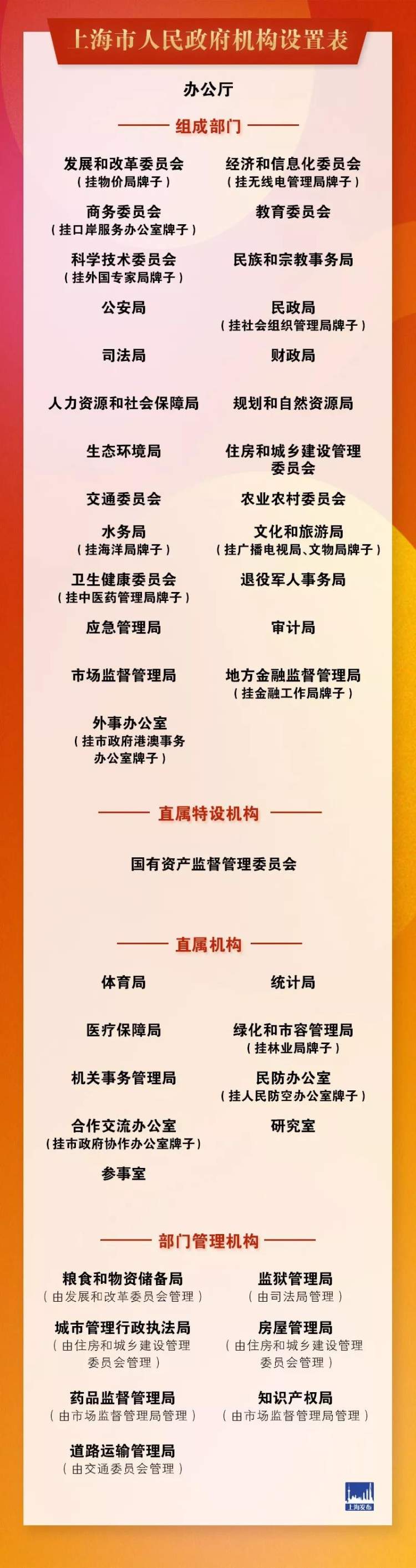 一图看懂市政府机构设置表!机构改革涉及部门今起用新名称啦! 周到君 2018-11-23 来源:周到上海 市民们注意啦! 上海市人民政府共设置工作部门36个。其中办公厅和组成部门26个,直属特设机构1个,直属机构9个。此外,设置部门管理机构7个。赶紧来认识一下! 来源:周到上海 作者:周到君 赞一个 (0)