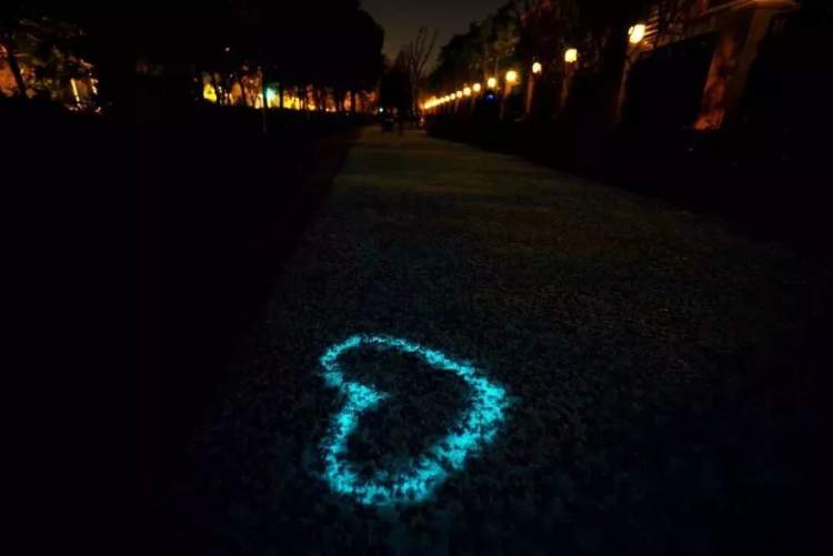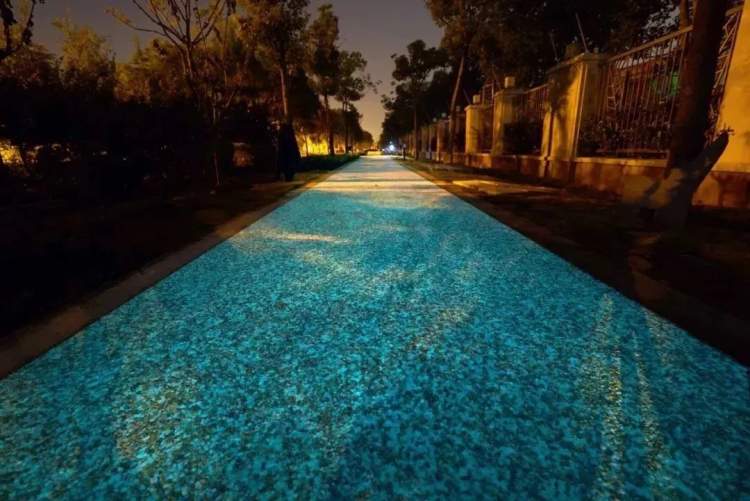 道路发光与其使用的透明结合料有很大关系。透明结合料与具有一定通透和反光效果的石料混合,同时在道路的设计上采用了超大空隙结构设计,发光材料在白天充分吸收并储存能量,夜间以光能的形式释放,使整个路面在高能和原始状态下切换,产生发光的效果。