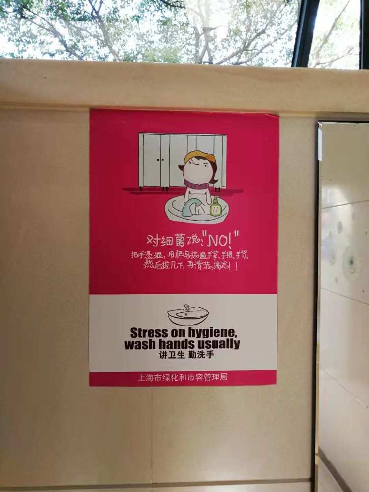 墙上还贴着卫生小提示,图文并茂的卡通风比简单粗暴的几个大字显得温馨得多。