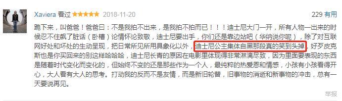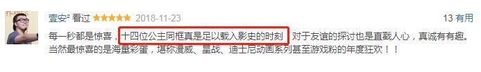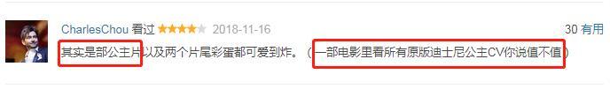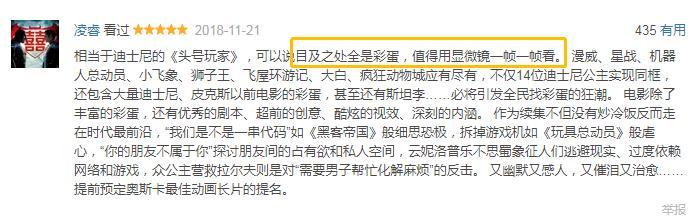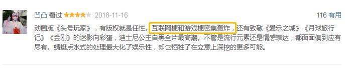 “互联网梗和游戏梗密集轰炸,还有致敬《爱乐之城》《月球旅行记》《金刚》的迷影向彩蛋,迪士尼公主自黑全片最高潮。”