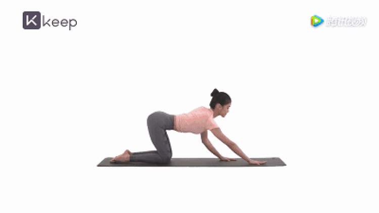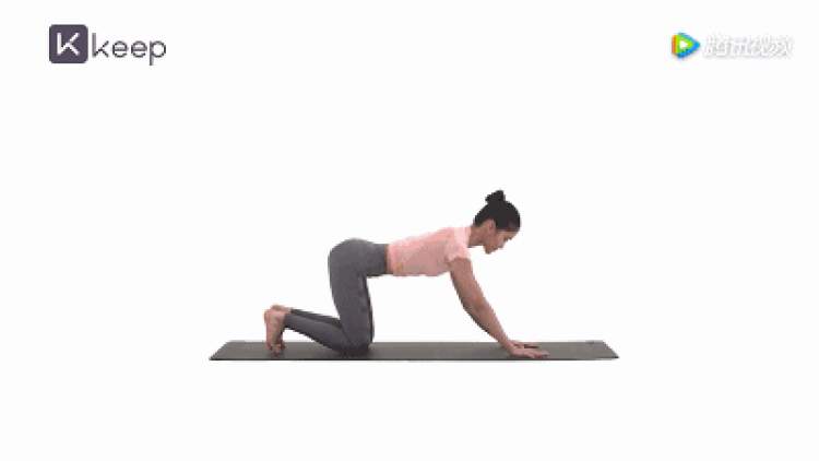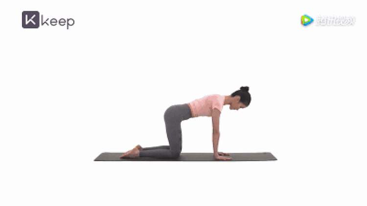 以跪姿俯撑在瑜伽垫上,保持双手、大腿与地面垂直,伴随均匀地呼吸,先呼气向下塌腰、仰头望向天花板;再吸气弓背、收紧腹部、收紧下巴。两个动作为一组,进行15次。