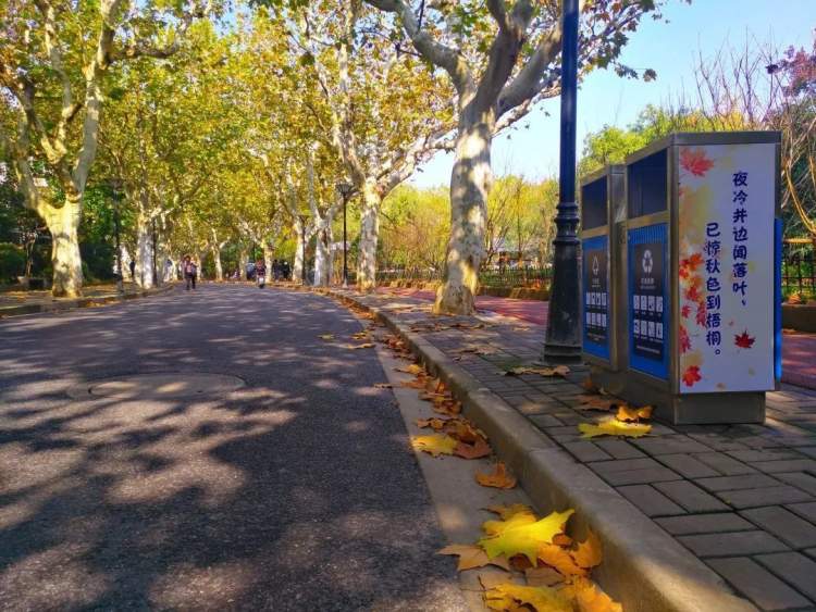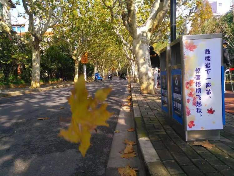 原来,除了满地黄金甲的落叶景观外,路边的垃圾桶摇身一变,成为“落叶诗人”了。瞧,“夜冷井边闻落叶,已惊秋色到梧桐”“梧桐一落叶,天下尽知秋”。