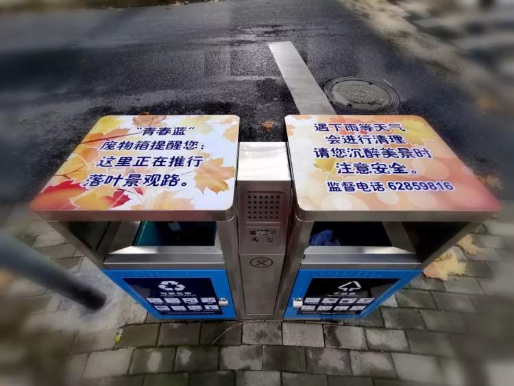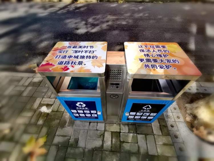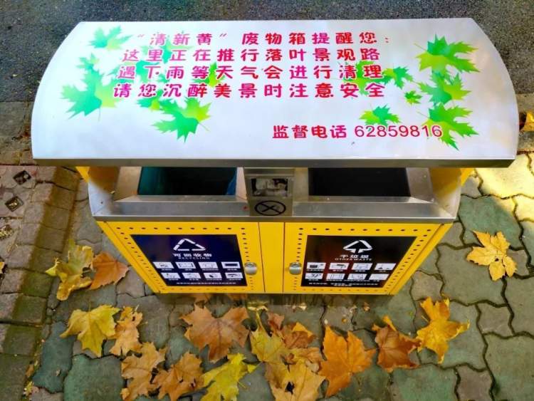 废物箱顶部设计了温馨的提示语,告诉市民这里正在推行落叶景观路,而不是道路保洁不到位。