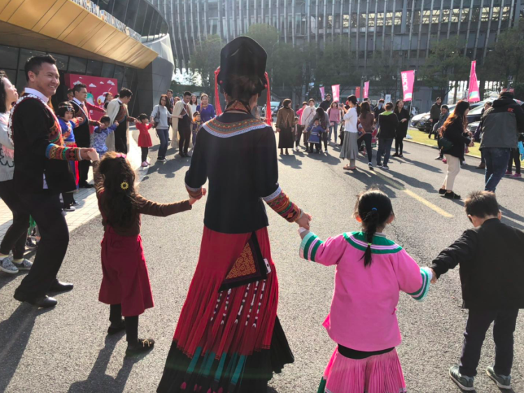 家长带着孩子们一边聆听彝族月琴、口弦的美妙乐声,一边围绕着“火塘”跳起达体舞,体验一把热闹欢腾的“火把节”。
