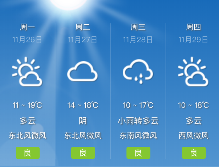 新的周一白天有小雨,最低气温14℃,出门记得带伞哦 周到君 2018-11-25 来源:周到上海 11月25日(周日)下午开始,魔都上空云系增多,夜里有短时小雨。 据上海天气网,新的周一白天本市阴有时有小雨,傍晚转多云。东北到东风3-4级。最低气温14℃,最高气温在18℃左右。 雨停之后,下周大部分时间上海以多云天气为主,下周六有短时阵雨。下周没有明显的冷空气影响本市,气温变化不大,最低气温保持在10-14℃,最高气温在17-18℃,昼夜温差比较明显,大家注意合理穿衣。 ■未来几日的上海天气 来源:周到上海 作者:周到君 赞一个 (0)