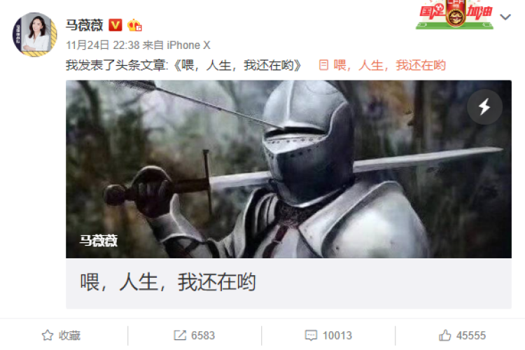 当晚,马薇薇还发布长文《喂,人生,我还在哟》,讲述自己在2015年底得了抑郁症之后的心路:“你看,并不是脆弱的人才会生病,也并不是乐观的人就可以向上。人生起起伏伏,有些事情,我看不开。”