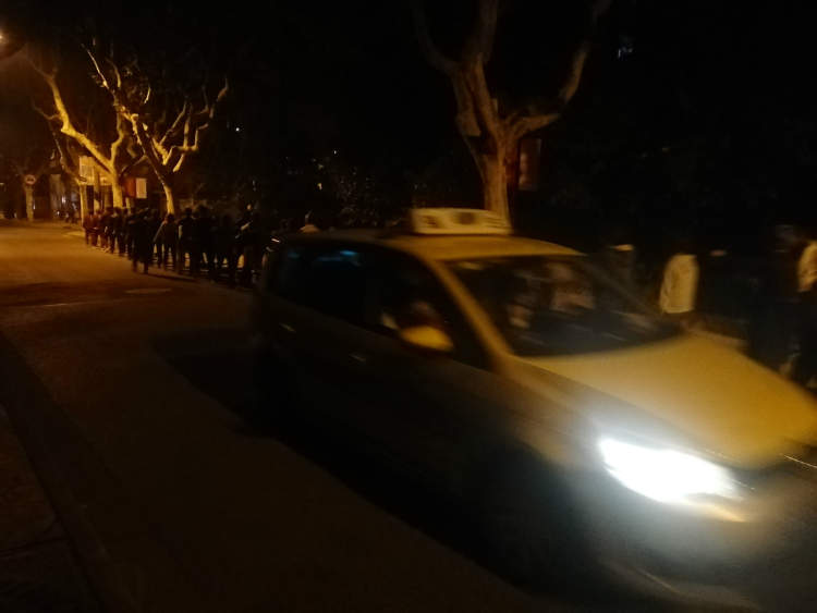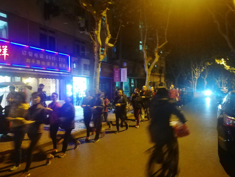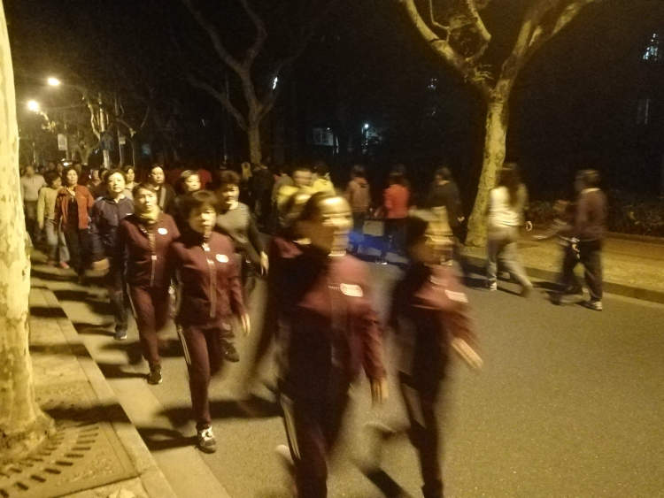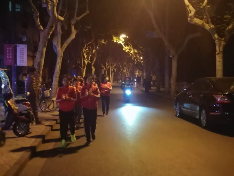 这四支队伍的规模基本都在40人/支左右,以五六十岁左右阿姨爷叔为主,唯一不同的是每支队伍的步行速度略有差异,有的偏快,有的偏慢,健步走的速度基本是依据队伍所放的音乐频率,从队伍头到队伍尾都能清晰地听到音乐声。每支队伍行经的路线也都是从苏家屯路路头走到路尾,然后再打个转,从路尾走到路头,像游戏中的“贪吃蛇”一般,如此反复,一晚上基本上要走上10余个来回。