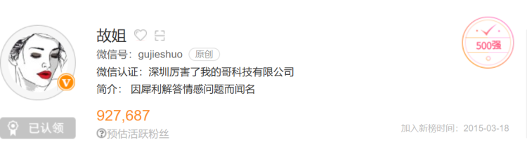 最近微信公号圈炸了锅,圈内粉丝超百万,每篇阅读平均在8w+以上的知名情感公号“故姐”,因发了一条插线板的众投广告成为众矢之的。新榜数据显示,故姐公众号的新榜指数为921.7,预估活跃粉丝为92万+,并且是微信公众号500强之一。