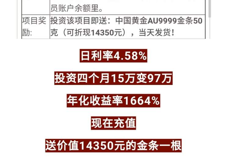 而起投是15万元,日利率4.58%,4个月加上本息就能获得超过97万元。不仅回报优渥,现在参与的投资者还能收到一根50克的金条或当场折现,也就是说本金相当于只用支付135650元。