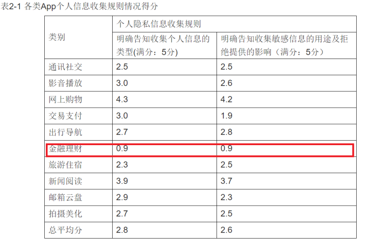 测评结果显示,针对是否明确告知用户收集个人信息的这一规则,10类App中金融理财类App仅得0.9分,有8款金融理财类App在隐私条款中未告知用户收集个人信息的类型。金融理财类App对敏感信息的告知情况也较差。