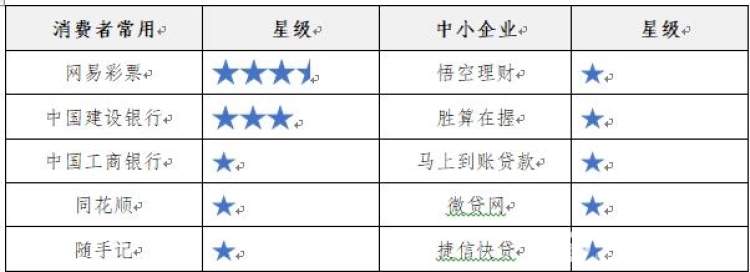 10款金融理财类App中,被评价为三星或三星半的是网易彩票、中国建设银行;胜算在握、微贷网、中国工商银行、捷信快贷、随手记、同花顺、马上到账贷款、悟空理财均只有一星。