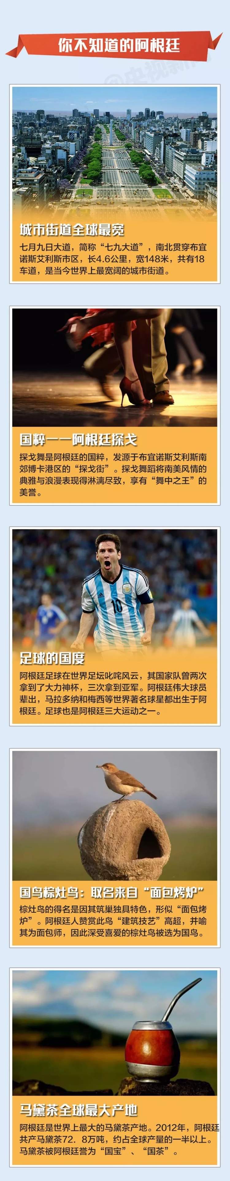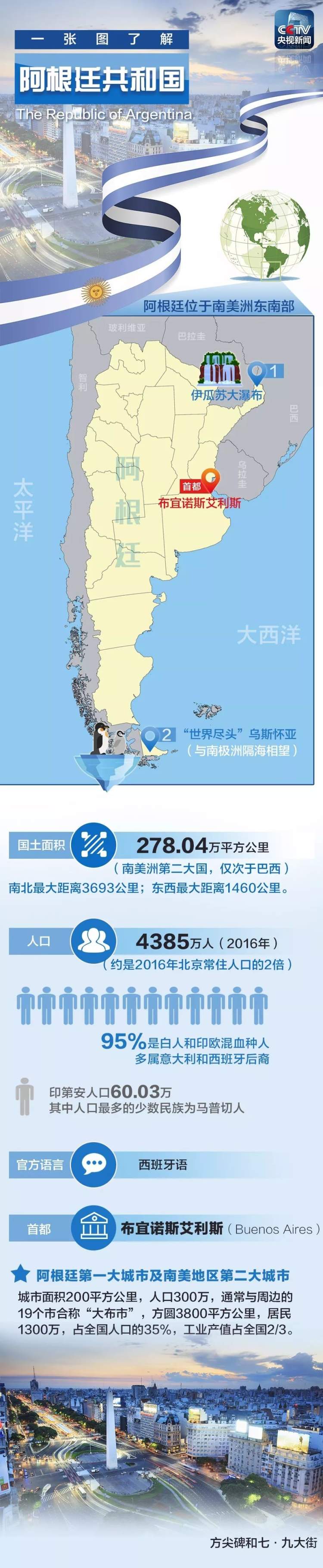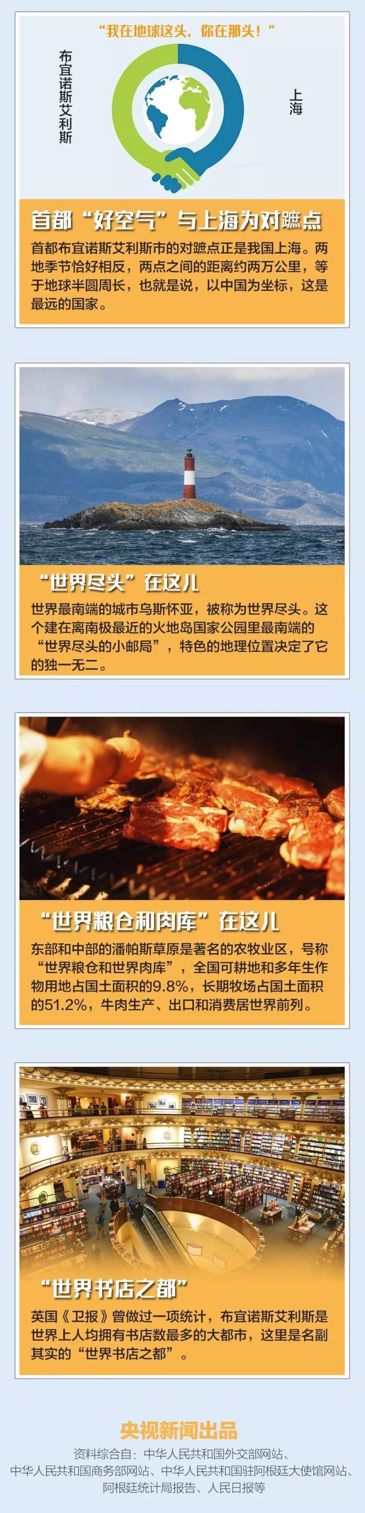 一图走近地球上距离中国最远的地方 2018-11-30 来源:央视新闻 当地时间29日晚,习近平的专机抵达阿根廷首都布宜诺斯艾利斯。习主席此访主要有两大活动:11月30日至12月1日出席G20布宜诺斯艾利斯峰会,12月2日对阿根廷进行国事访问。 提起阿根廷,想必大家能联想到很多——足球、烤肉、贝隆夫人……今天,跟随小编一张图走近这个距离中国最远的地方↓ 更多新闻 时隔12年,中国女足再出“亚洲天后” 你好,阿根廷! 监制/唐怡 主编/张天宇 编辑/李婷婷 ©央视新闻 赞一个 (0)