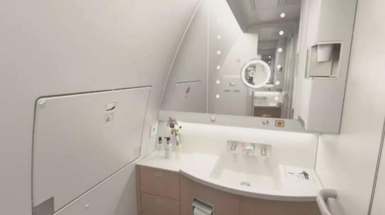另外,东航A350飞机的洗手间参照5星级设计,选用镀铬金属配件,红外感应式龙头,加宽大理石台面,后缩式镜面,马赛克图案地板让整体设计和空间上都得到了极大的优化。