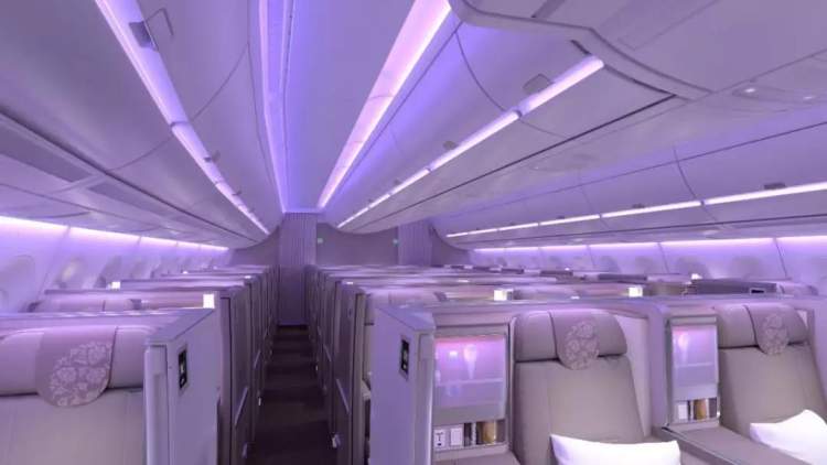 A350全LED座舱情境灯光系统可提供多达1670万种不同颜色,有无数种组合和场景。