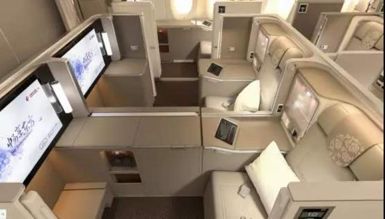 头等舱(豪华公务舱)采用1-2-1布局,座椅均采用全平躺设计;中间两个座椅可变成支持四个人交流的“社交区域”;每个旅客位置都带两扇可移动滑门,关闭后可形成旅客独立的私密包厢空间。