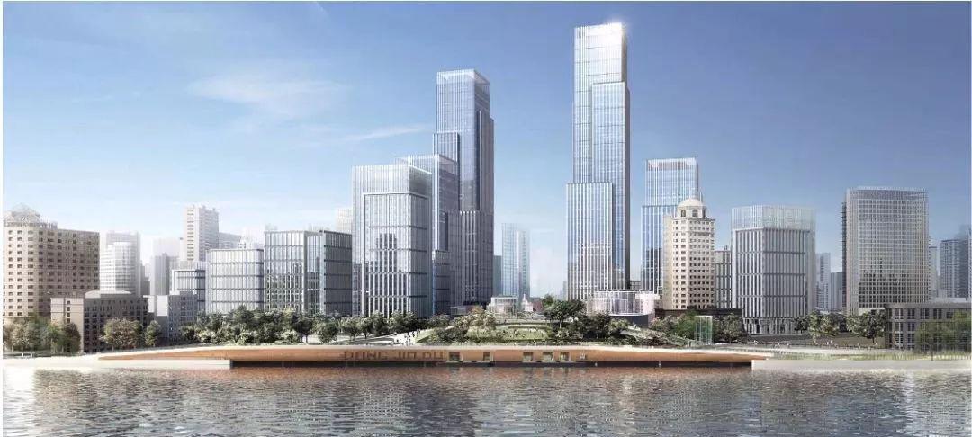 从浦江中正在行驶的船只望去,景观平台的立面看起来像是一道斜坡状的、曲线柔和起伏的立面。暖陶色的水平百叶从平台边界悬挑出来,为外立面增添了些许的透明度。未来,在鳞次栉比的高楼大厦中将成为一道美丽的风景线。