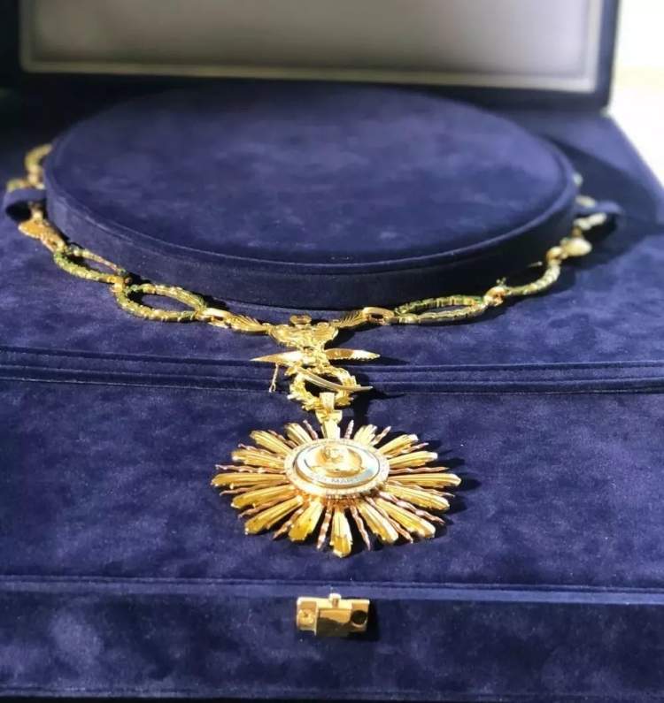 △“解放者圣马丁大项链级勋章”以阿根廷国父圣马丁命名,是阿根廷政府授予外国公民的最高荣誉,由国家元首亲自颁授。(央视记者彭汉明拍摄)