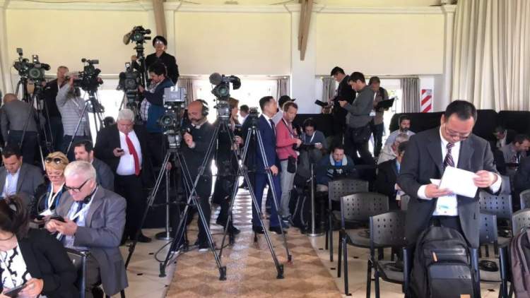 △两国元首在会谈后共见记者,记者现场等候。(央视记者彭汉明拍摄)
