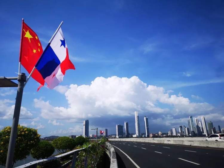 △公路上悬挂的中巴两国国旗迎风飘扬。(央视记者周志国拍摄)