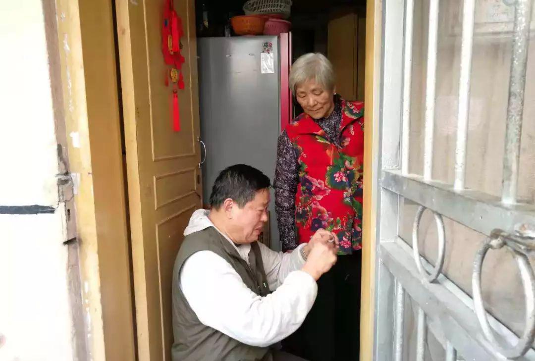 装置发明人陈益鸣为居户示范安装门锁防盗装置