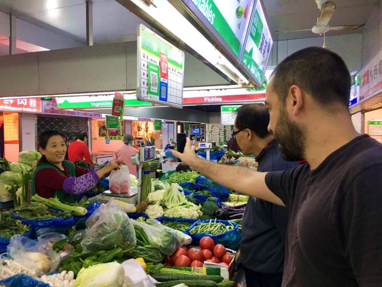 而当日周到君还遇到了一位带着孩子前来“买小菜”的外国爸爸。来上海工作了13年的他,不仅能得心应手地与店员进行沟通,看菜、挑菜、一键支付的一套流程更是熟门熟路。他告诉周到君,他在巨鹿路这一带住了将近1年,经常来这家生鲜市场买菜。市场改造过后环境和选购体验于他而言都得到了优化。而针对一些“外国人更喜欢城市超市”的说法,他哈哈一笑,说道:“我更喜欢来这个菜场,能感受到市井气息,这和超市可不一样。”临走前,他还和店员互道一句“谢谢”,让人更感觉到这家小市场的其乐融融。