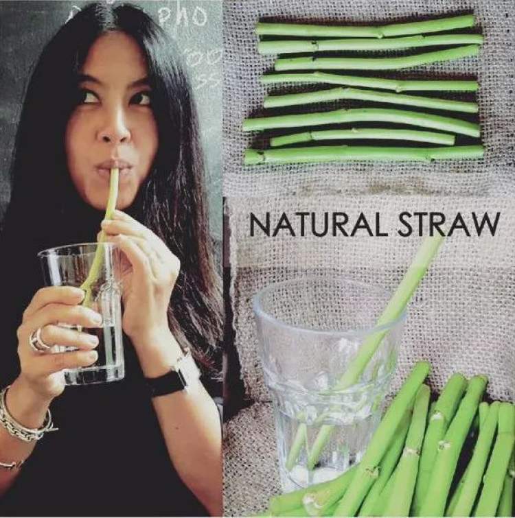 在曼谷的一家素食餐厅,提供空心菜做的天然吸管,就是一段绿色的空心菜茎。这是当地的一种水生空心菜,炒着吃很美味,这种茎很坚硬,里面是空心的,不仅粗细弹性恰到好处,而且价格低廉,适合做吸管。