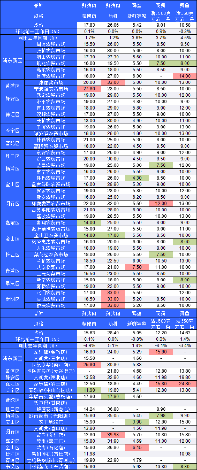 ■粉底标注代表该肉蛋鱼品种在上述农贸市场或超市的最高价;绿底标注代表该肉蛋鱼品种在上述农贸市场或超市的最低价