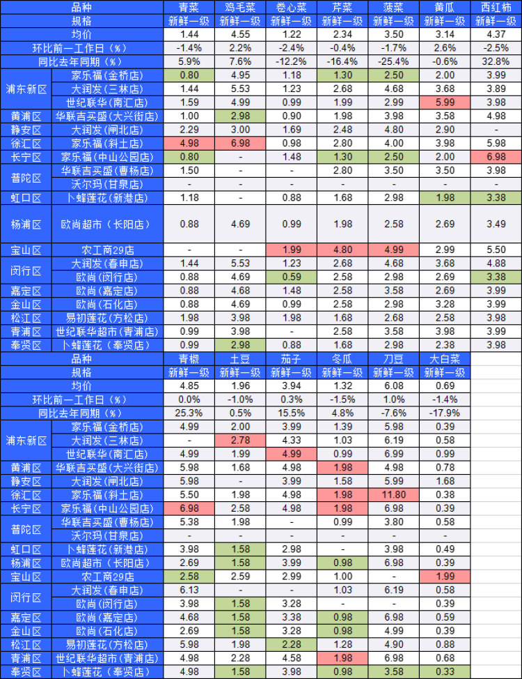 ■粉底标注代表该蔬菜品种在上述农贸市场或超市的最高价;绿底标注代表该蔬菜品种在上述农贸市场或超市的最低价