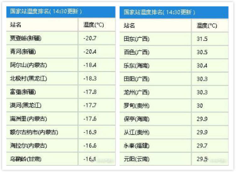 最冷的地区出现在新疆、内蒙古、黑龙江,最热的地区出现在广西、海南、贵州……差距几乎在50℃左右了,不仅要感叹我国幅员辽阔啊真辽阔。