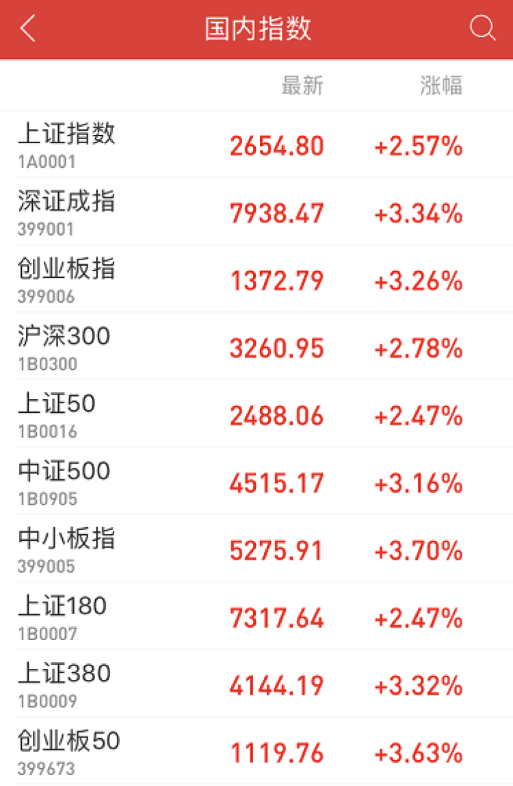 今天受多重利好消息影响,沪深股市大幅高开,重要指数全线飘红。截至收盘,上证综指上涨2.57%,收于2654.80点。深证成指大涨3.34%,报7938.47点。创业板指和中小板指分别上涨3.26%和3.70%,报1372.79点和5275.91点。