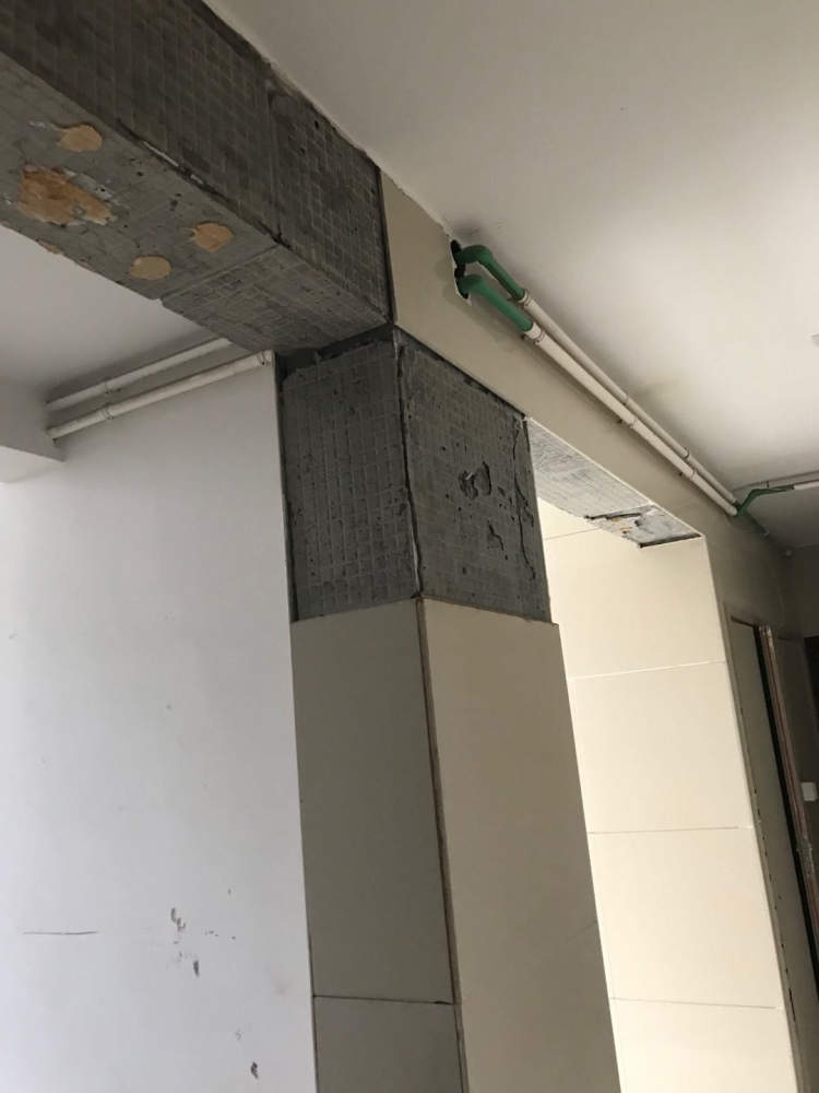 后来,她家过道、电梯口以及门额上的墙面砖,也陆陆续续脱落了下来。为了防止墙面砖脱落伤人,物业公司派人把那些即将脱落的墙面砖一一剥下来,放在过道里,堆在楼梯口。一年半时间过去了,这些脱落下来的墙面砖还堆在那里,裸露的墙黑乎乎的,丑陋地躲在暗处。没有脱落的墙面砖,有些也已经松动了:“我们不知道它什么时候掉下来,也不知道哪一块会掉下来。出电梯前先张望一下,然后快步进家门,才算安全。”